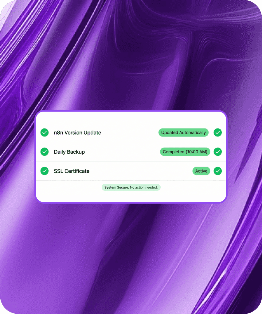 Classic n8n self-hosted setups require updates, security configs, and backups. With us, you just use the product. Updates, protection, and stability are our job. Save the hours you used to spend in the console.